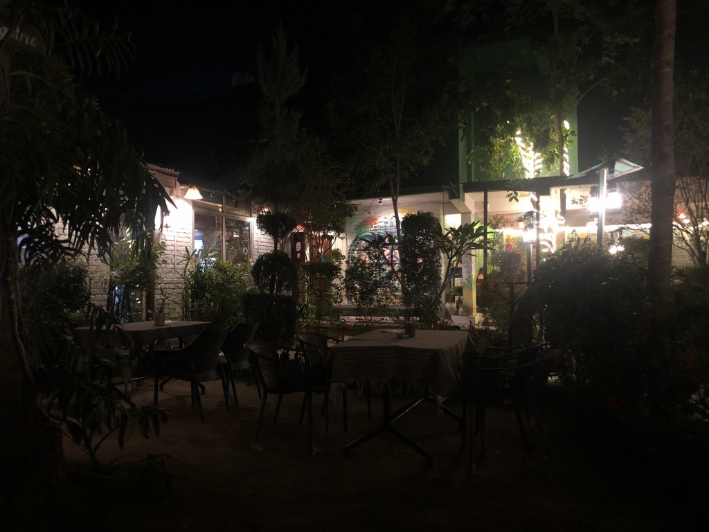 It was our last evening and we made our way out of the crowd and got back on to the bike. We wanted to sit in a cafe after all that buzz and I saw a board that said ‘The 60’s cafe’. Why not this one? And the moment we walked in, we felt right at home. Pretty outdoors full of greenery and a whole lotta knick knacks and posters of the 60’s flower power era and rock and roll. Why didn’t we come here last night? The gang would have loved it.