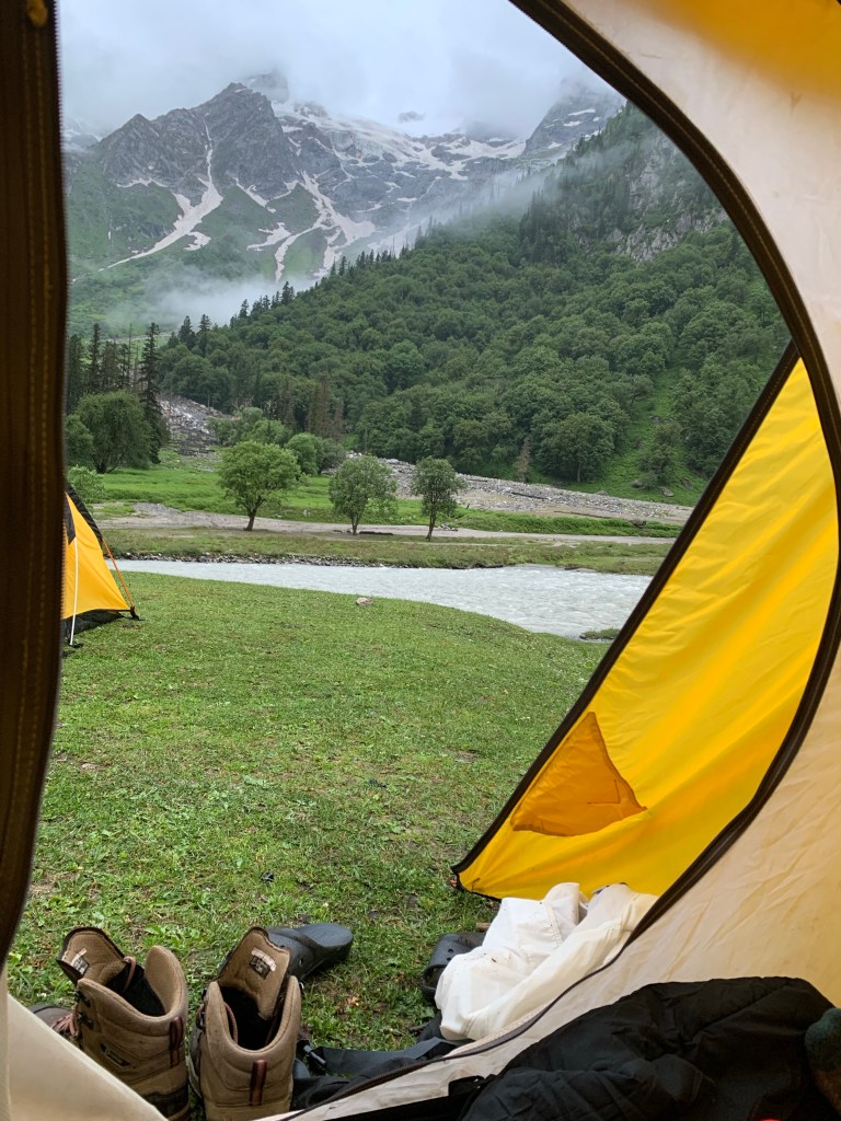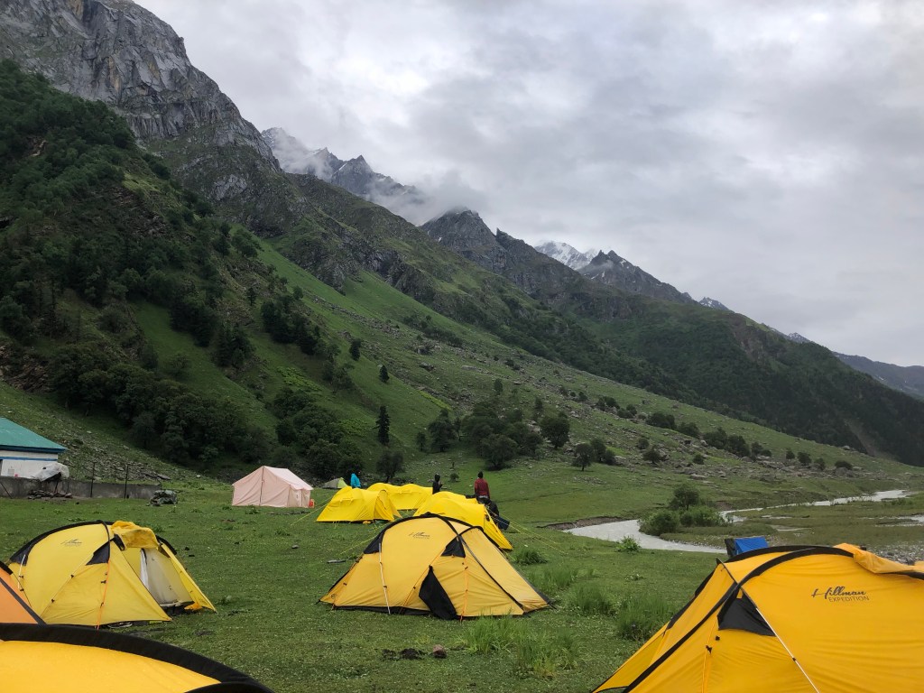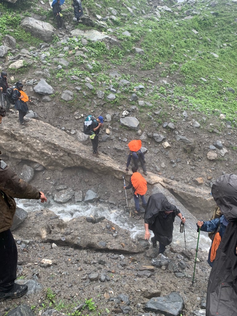But the rains weren’t stopping either, so we had to do with whatever shelter we had under a small canopy of trees, we also ate our packed lunch in the rains laughing away. It was a different experience. There was also the Trek the Himalayas group coming in following us, so for the next 3 days we would always bump into each other camping close by.