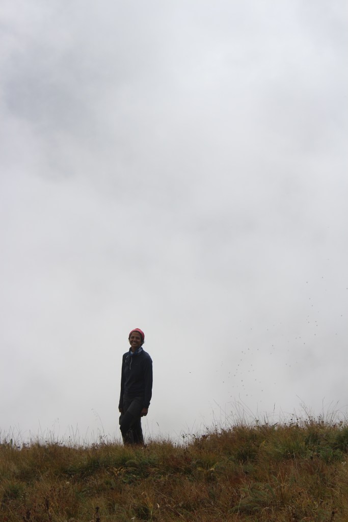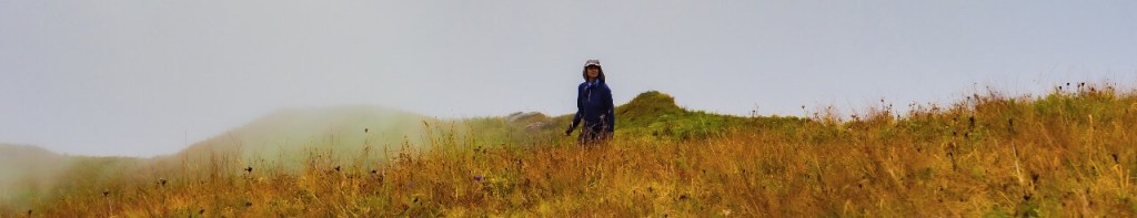 After we got ready, we ascended our way up and over towards the bugyal. And after a gradual ascent walk after the steep ascent we were suddenly surrounded by a massive bugyal. The weather being very cloudy, the entire place was surrounded by mist. It looked ethereal. It was so filled with mist that one couldn’t see any mountains in front of us. I kicked off my shoes and walked the whole bugyal barefoot. I just wanted SILENCE. This constant chattering was bugging me. And I did see a few who were exactly like me. Korak who went far away to be on his own. Jayesh who quietly moved away clicking beautiful pics, ditto with Darshan, Gayatri also walked on the bugyal being in her own world, Devraj taking out his diary and sitting away.
