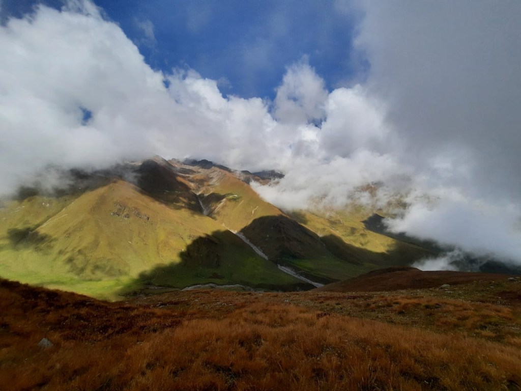But oh man! When would this Bugyal end ?? Pradeepbhai kept on going from one ridge to another with rough grass terrain, and it seemed freaking endless! And Deep was teasing me, asking me, Why don’t you roll on this meadow now?? This was because for the past few days I kept telling that I want to roll on the meadows!! Well I imagined it would be soft, who would have thought a bugyal would be this unforgiving? One roll and I would go all the way down and that would be my end! 😂 This went on atleast for another hour with mist and fog and whatnot! When will it freaking end? Will we see some lower altitude at all??