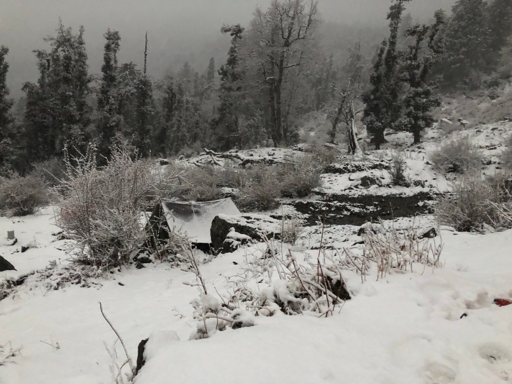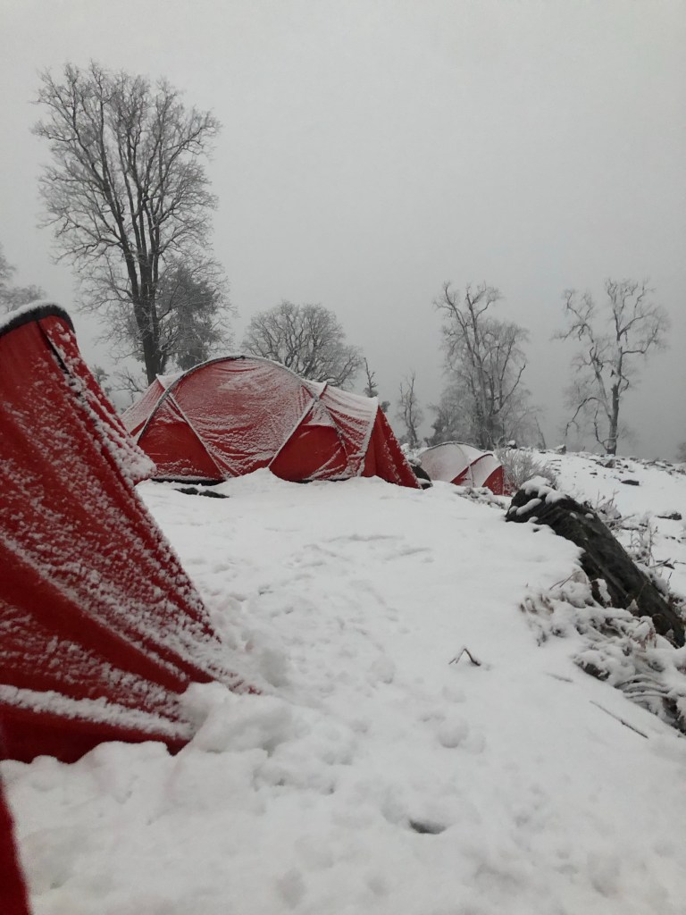 I woke up with a start to some voices, what time was it? It was 3 am and Meenakshi and the staff were shaking our tents vigorously to remove the snow! Man! It was snowing hard and these guys were ensuring each and every tent didn’t clamp under heavy snow! And they were shovelling snow making paths in freezing temperature. They were at it the whole time.