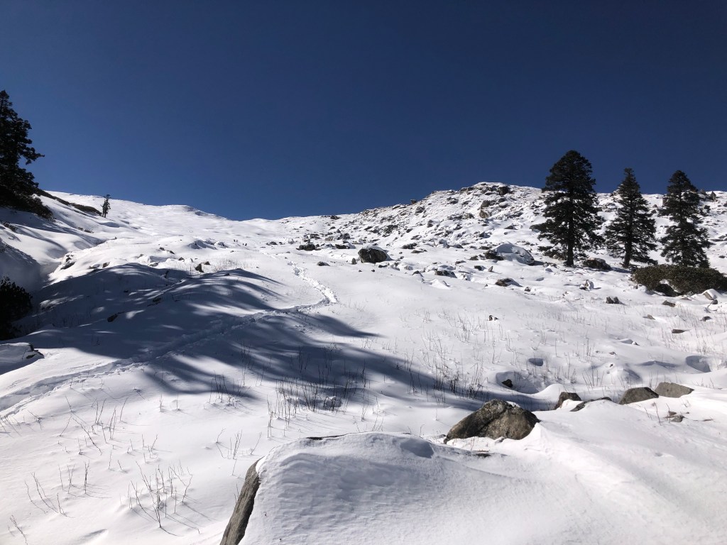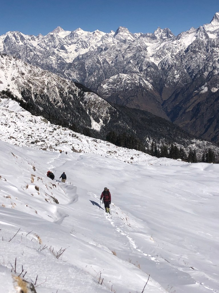 Chatting on and off with Dhairya the descent was happening fast. There were slippery sections as the sun was blazing now and with the snow melting, there was lots of slipping. Luckily none of us fell hard, just the usual stuff, knees were taking a beating because of the descent.