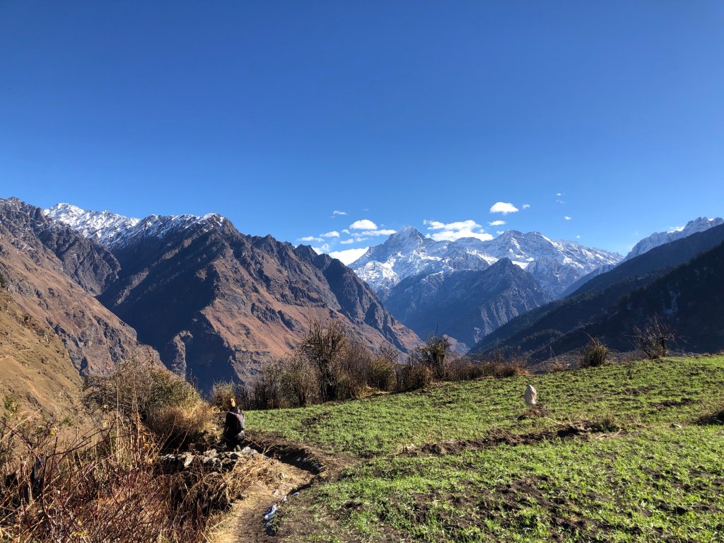 Trekking back over melting snow to wet trails with full sunshine we were soon approaching the lush outskirts of the village, the whole scenery opened up, green pastures with the benevolent Himalayas with its arms open wide. How could I explain to anyone who doesn’t trek what it does within when you experience contrasts in just a few days..